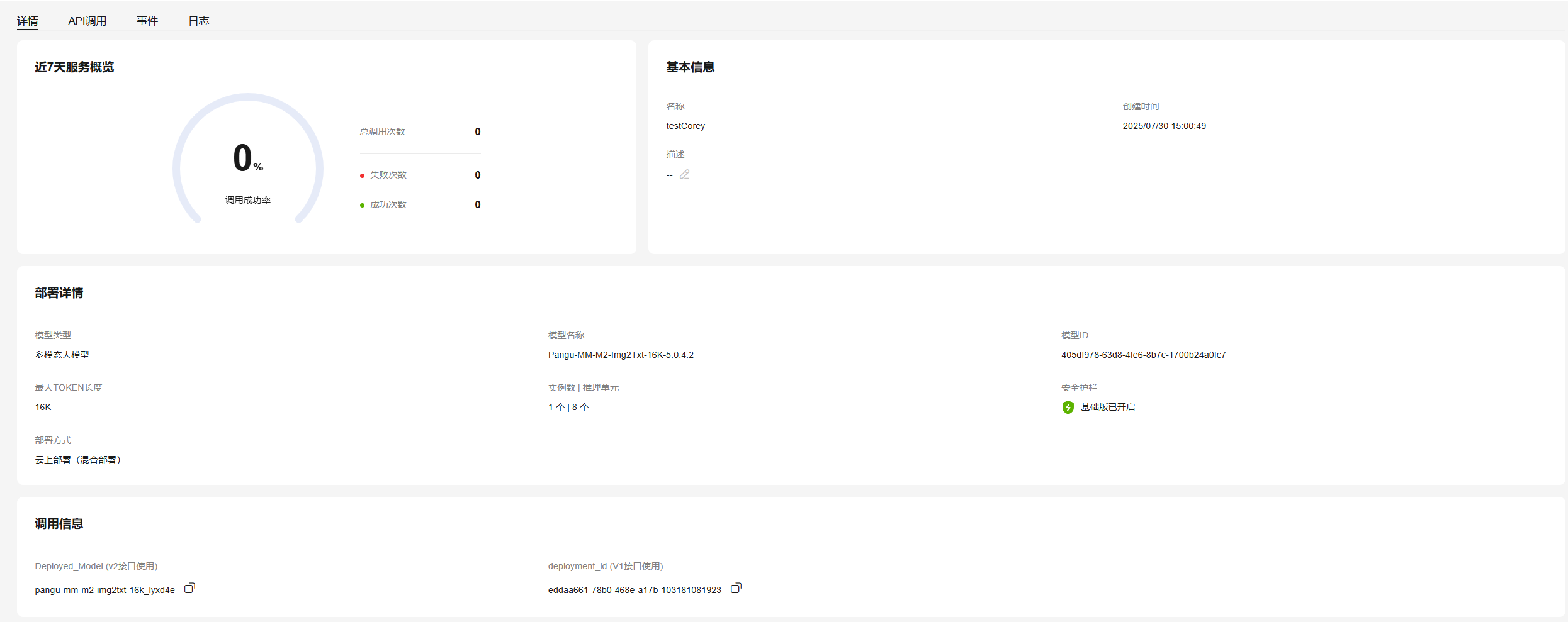 - 单击模型名称进入详情页,查看模型的部署详情、部署事件、部署日志等信息。