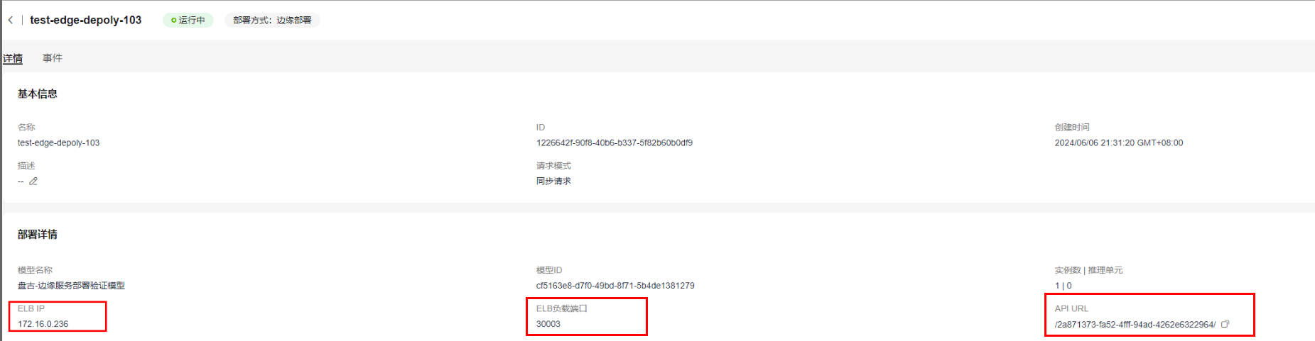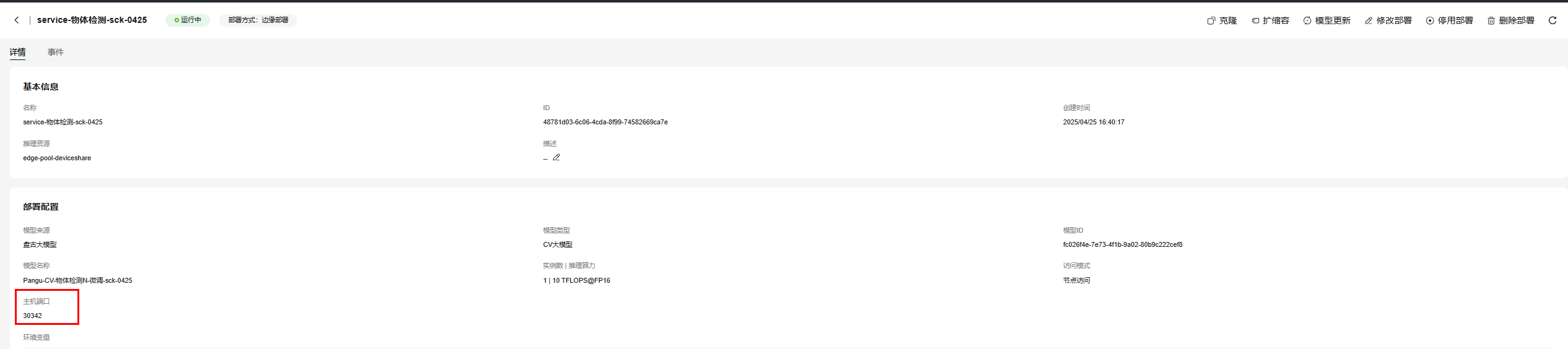 获取边缘部署模型的调用路径。在“我的服务”页签,单击状态为“运行中”的模型名称,在“详情”页签,可获取模型调用路径。