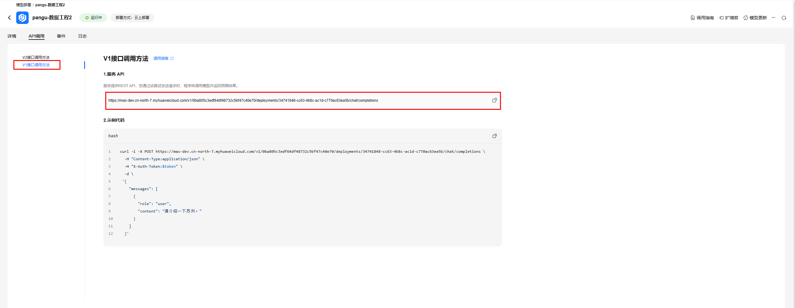 预置模型或训练后的模型部署成功后,可以使用“文本对话”API实现模型调用。三方大模型推理服务支持使用盘古推理接口(V1推理接口)调用,也支持使用业界通用的OpenAi格式接口(V2推理接口)调用。V1接口、V2接口的鉴权方式不同,请求体和返回体略有差异。