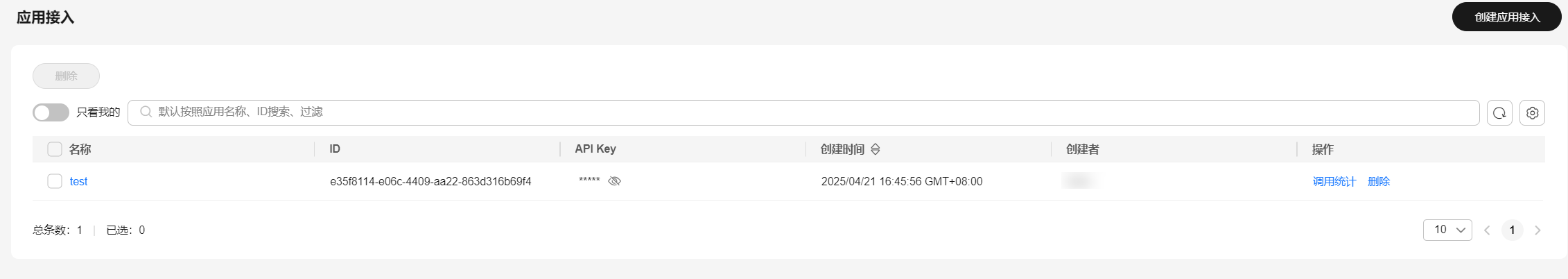 对于已经接入API Key方式鉴权的模型,可以直接在“应用接入”页面,单击操作列“调用统计”按钮跳转至“调用统计”功能页查看调用信息。