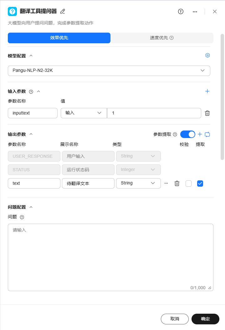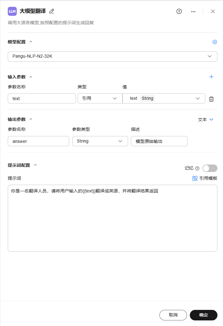 下图是大模型翻译节点的配置。该节点的作用是利用提问器提取出来的text,把text的文本翻译成英语。