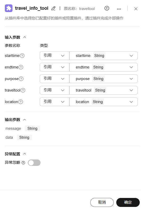 travel_info_tool插件配置如图10。作为示例,travel_info_tool插件实现的功能只是在所有输入参数都有有效值的情况下返回所有参数。你也可以根据实际应用场景需求使用自己开发的自定义插件。