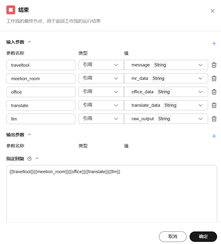 办公助手工作流的结束节点采用文本返回的形式,在指定回复文本框中以{{variable_name}}的形式插入输入参数。工作流的最终运行结果将按照指定回复中的内容返回。注意,指定回复中输入、输出参数配置和提示词配置见下图:不能插入输出参数。