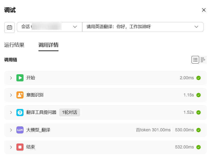 查看调试结果,包括运行结果与调用详情。调试结果示例如下: