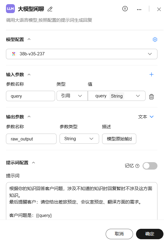 大模型闲聊节点的作用是在用户输入的意图不属于差旅、会议室预定和翻译相关,也不涉及敏感话题时,提供闲聊服务。 下面是该节点的配置。