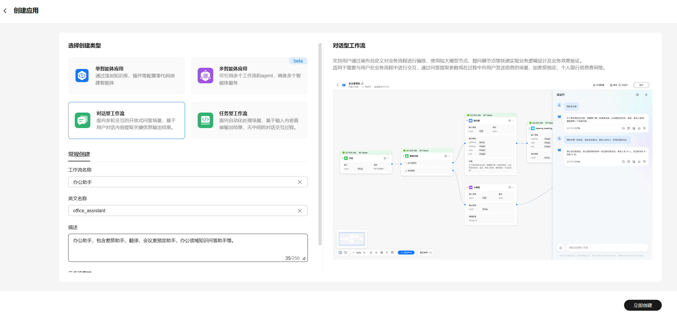 - 在应用管理界面右上角单击“创建应用”。选择创建类型为“对话型工作流”,按照如下描述配置完成后,单击“立即创建”之后,你将进入工作流编排页面。