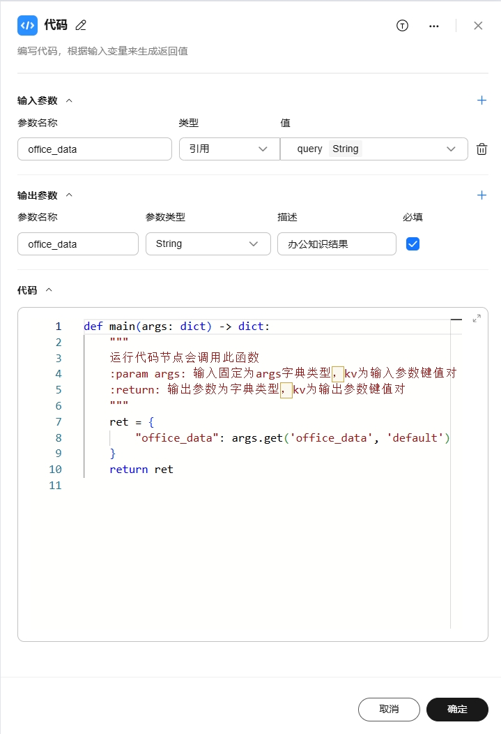 此处代码为:获取输入参数,即插件的输出(args中的office_data),未做处理,直接在输出参数返回(ret中的office_data)。
