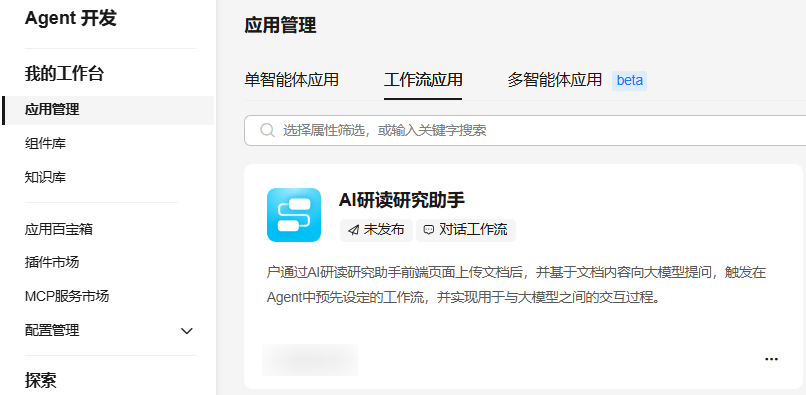 - 在左侧导航栏中选择“应用管理 > 工作流应用”进入工作流应用开发主页面。该页面包含所有已经创建的工作流应用,可根据搜索框搜索目标工作流应用。