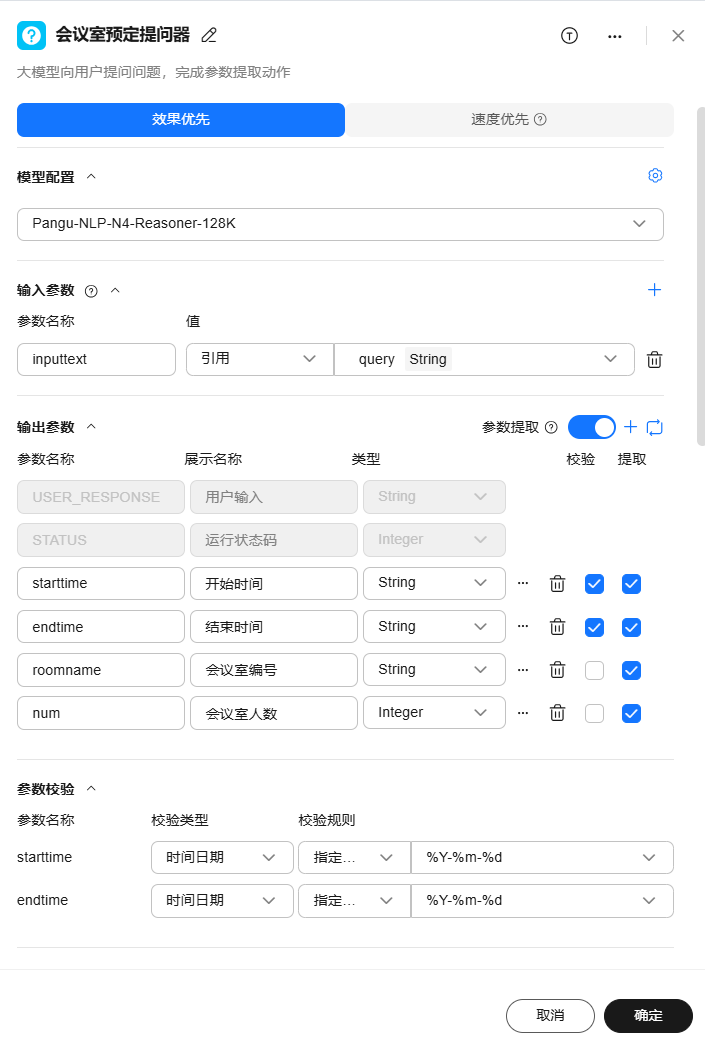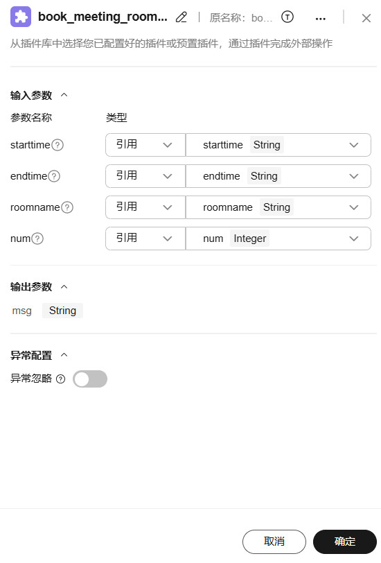 book_meeting_room_tool插件配置如图13。作为示例,book_meeting_room_tool插件实现的功能只是在所有输入参数都有有效值的情况下返回所有参数。你也可以根据实际应用场景需求使用自己开发的自定义插件。