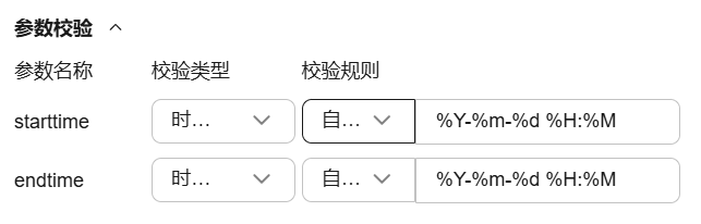 - 参数校验配置见下图。starttime/endtime的校验类型均为时间日期 ,校验规则均为指定格式 。