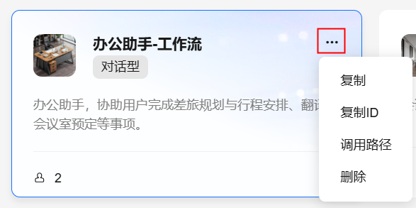 在Agent平台中创建工作流之后,你可以管理工作流,单击工作流卡片右上角的"...",执行复制工作流、删除工作流、查看工作流调用路径等操作。