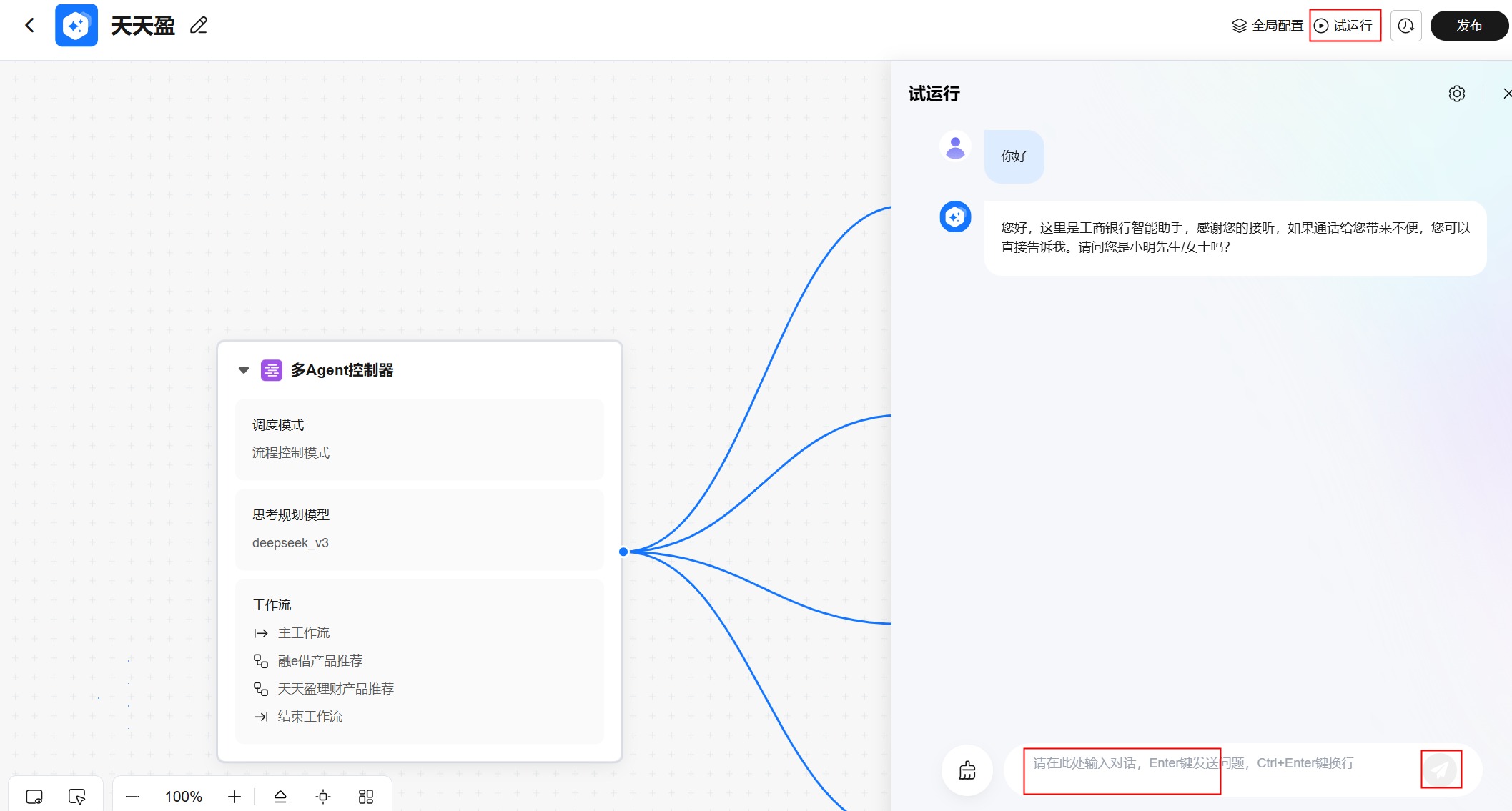 在页面右上角,单击试运行进入调试页面,在下方输入对话内容和agent进行对话