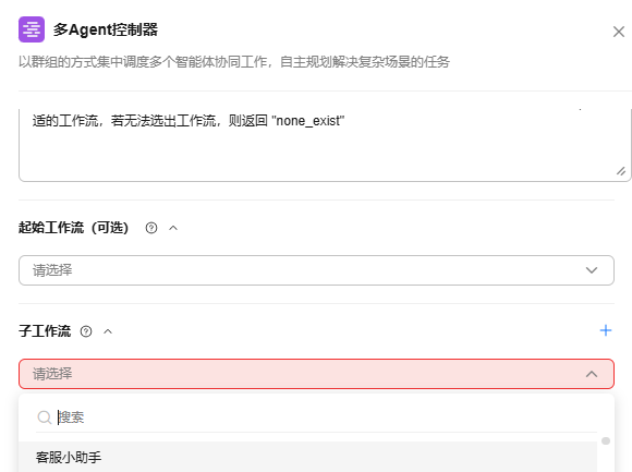 - 在“多Agent控制器 > 子工作流”模块,单击“