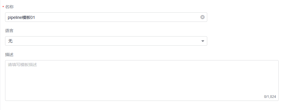 - 基本信息:可编辑模板的名称(必填)、语言(支持Java、Python、Node.js、Go、.Net、C++、PHP、ArkTs,默认选择“无”)、模板描述信息。