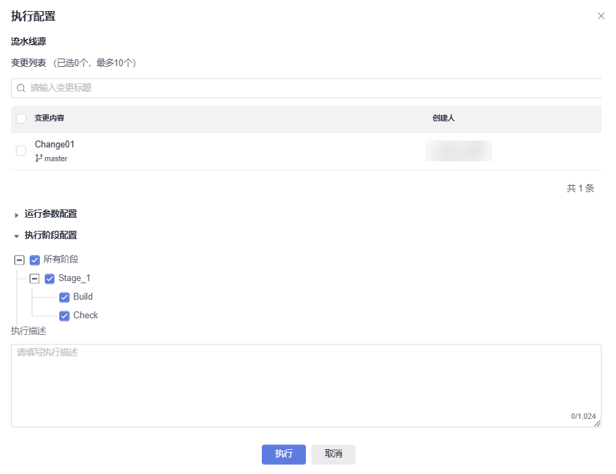 - 变更列表:变更列表展示阶段状态为“待发布”和“发布中”的变更,运行变更流水线时需要选择一个或多个变更。