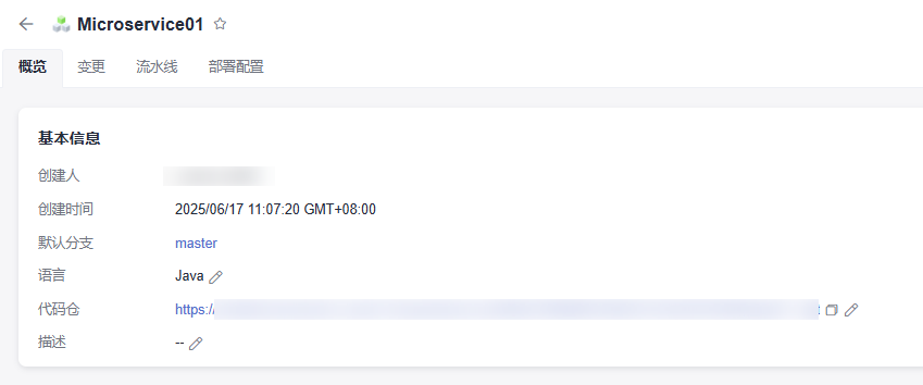 概览页展示微服务的创建人、创建时间、代码源等信息,可修改微服务开发语言、关联的代码仓库和描述信息。
