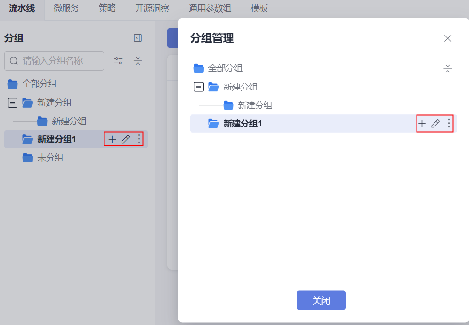 - 创建完所有分组,单击“关闭”,完成分组创建,返回到流水线列表页面。