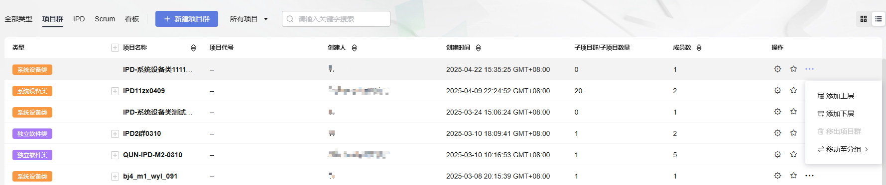- 项目群当前仅支持由IPD-系统设备类和IPD-独立软件类项目模板来创建,需升级到专业版或专业版以上套餐,规格详情请参考需求管理服务套餐说明或CodeArts套餐说明。