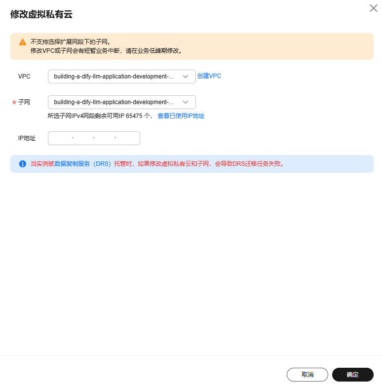 - 修改VPC或子网会有短暂业务中断,请在业务低峰期修改。