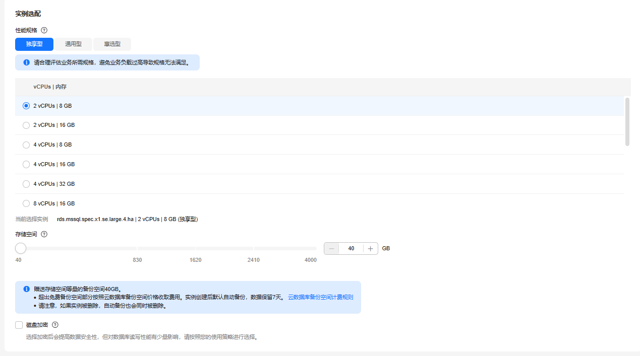 说明:- RDS购买磁盘加密后,在实例创建成功后不可修改磁盘加密状态,且无法更改密钥。选择“磁盘加密”,存放在对象存储服务上的备份数据不会被加密。