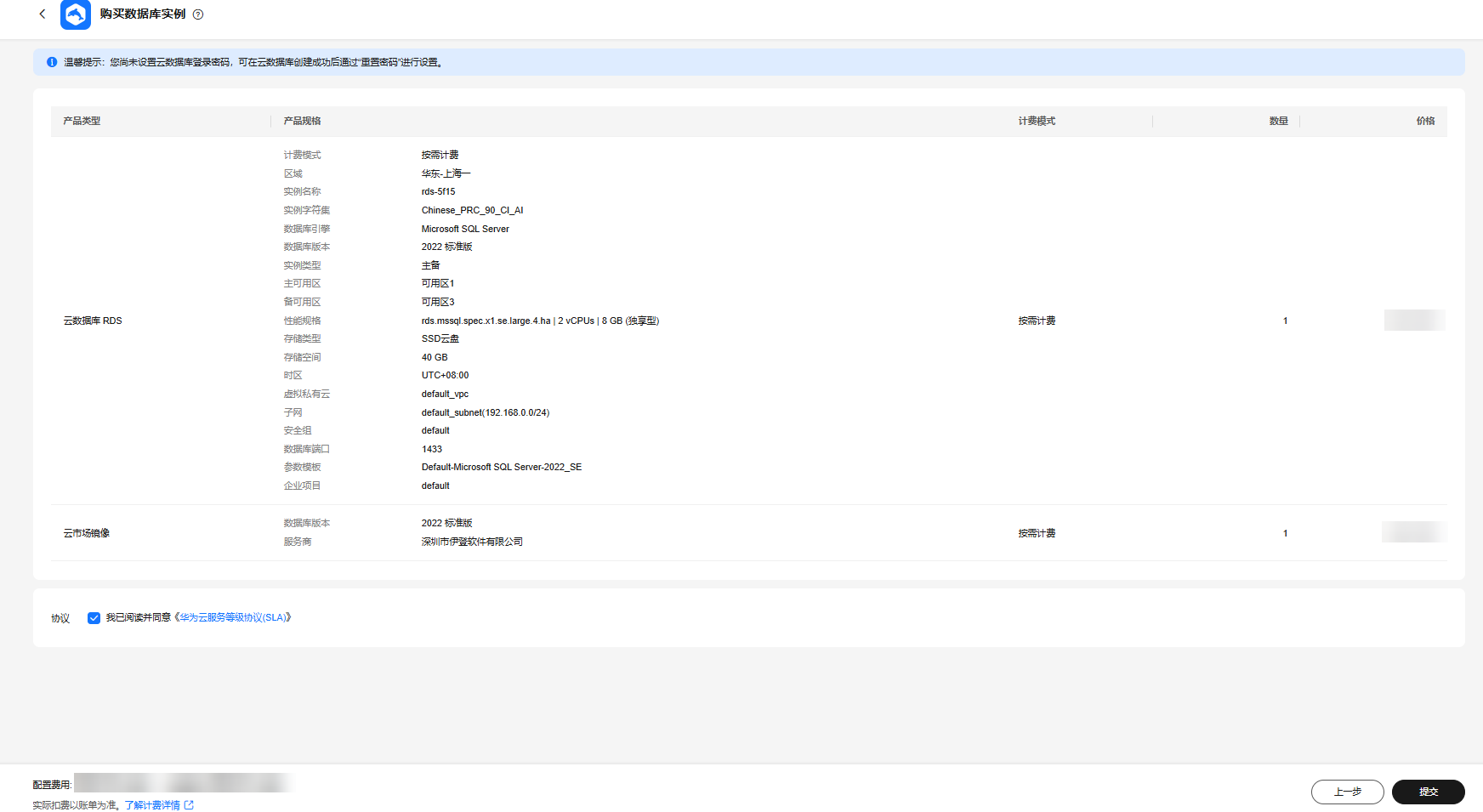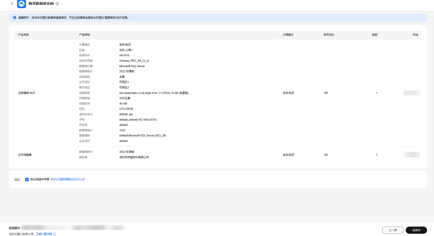 - 如果需要重新选择实例规格,单击“上一步”,回到上个页面修改华为云关系型数据库实例信息。