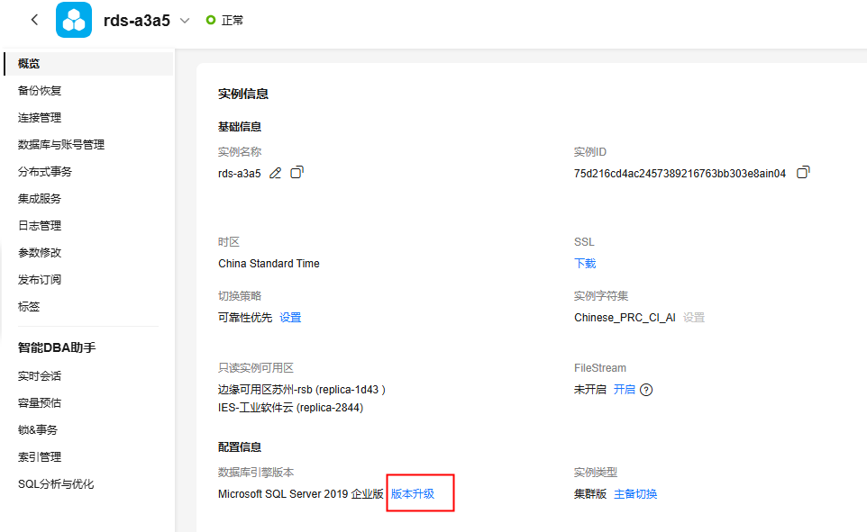 RDS for SQL Server支持升级数据库引擎版本。数据库引擎版本的升级,涉及问题修复、性能提升和其他改进。