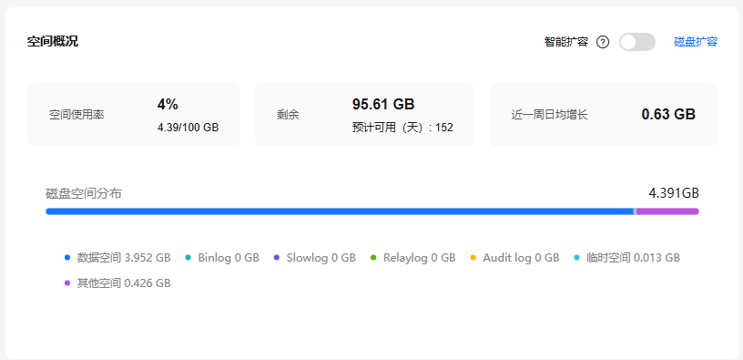 - 磁盘扩容:磁盘扩容期间,服务不中断。您可以设置存储空间自动扩容,在实例存储空间达到阈值时,会触发自动扩容。