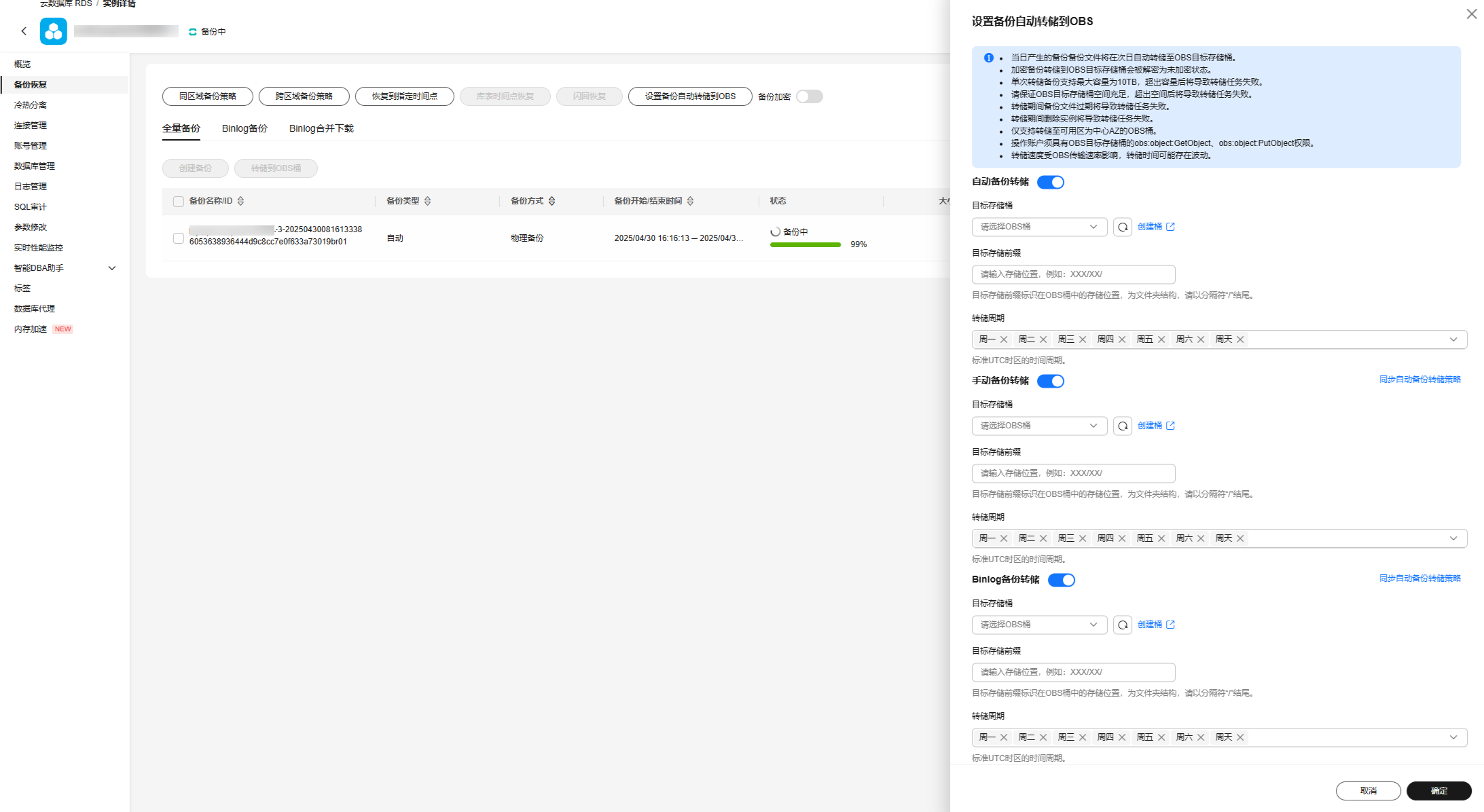 - 在右侧弹出页面,填写相关配置项,单击“确定”,设置备份文件自动转储到OBS桶。