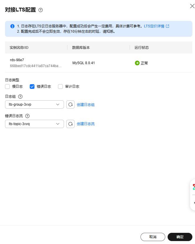 - 在右侧弹框中,日志类型选择错误日志,在下拉框分别选择对应的日志组和日志流,单击“确定”。