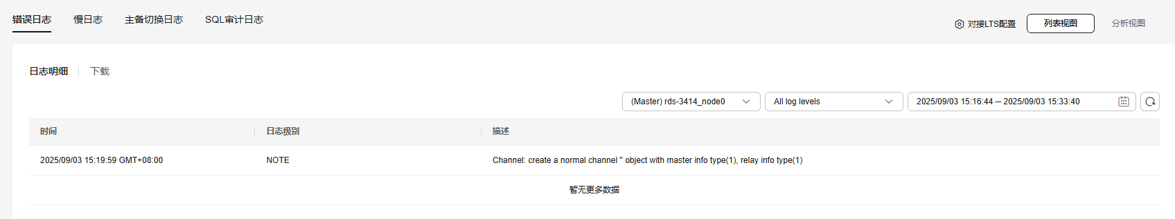 错误日志记录了数据库运行的实时日志,您可以通过错误日志分析系统中存在的问题,您也可以下载错误日志进行业务分析。