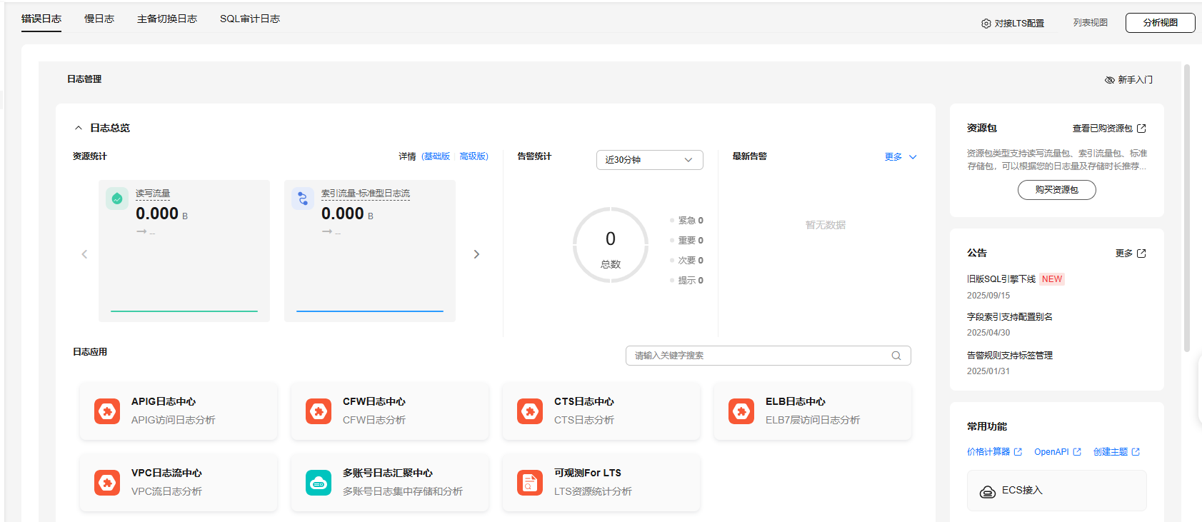 - 默认在“错误日志”页签,单击页面右上方的“对接LTS配置”。