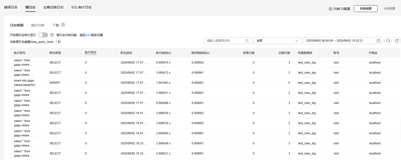 - 在“日志明细”页签下,查看慢SQL语句的详细信息。