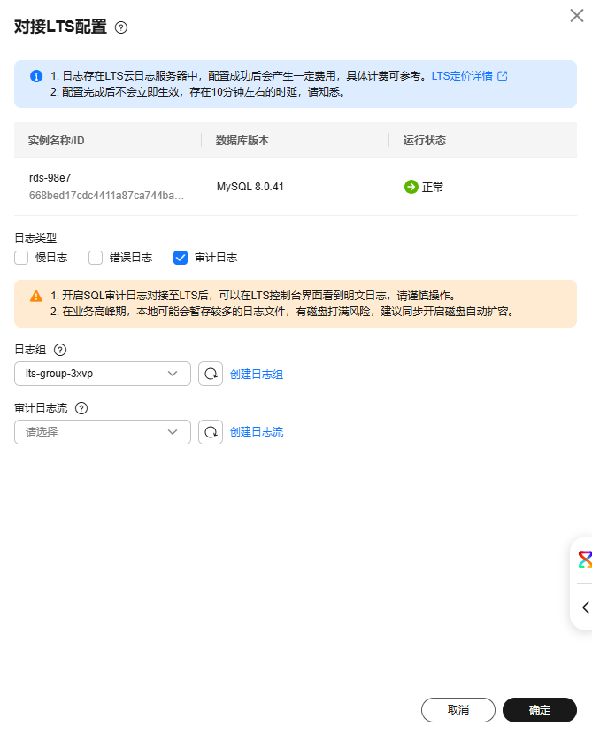 - 已开启SQL审计开关,此时再开启LTS审计日志,审计日志将延续已有的SQL操作类型策略,且会在原有的审计日志计费基础上增加您LTS的审计日志收费。原有的审计日志费用会在您关闭原有审计策略后终止。