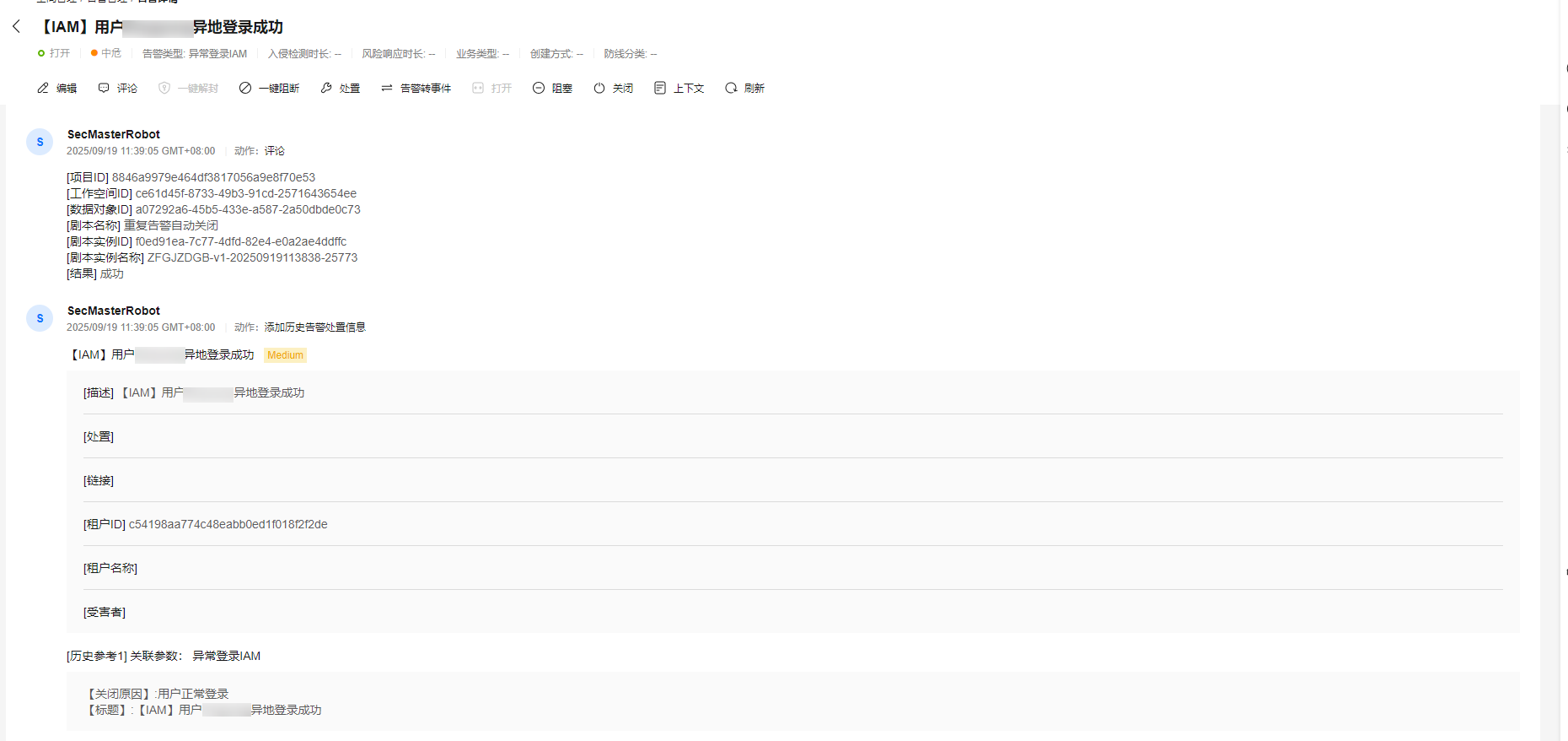 剧本生效后,安全云脑新增的IAM告警会自动添加已关闭的相似告警的关闭评论。