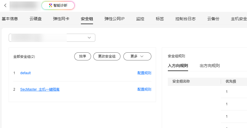 - 审批完成后,安全云脑自动将主机添加至虚拟私有云 VPC安全组,安全云脑自动阻断出方向(主机访问第三方)和入方向(第三方访问主机),可在VPC查看到名称为“SecMaster_主机一键隔离”的安全组 。查看安全组详细操作请参见查看安全组。
