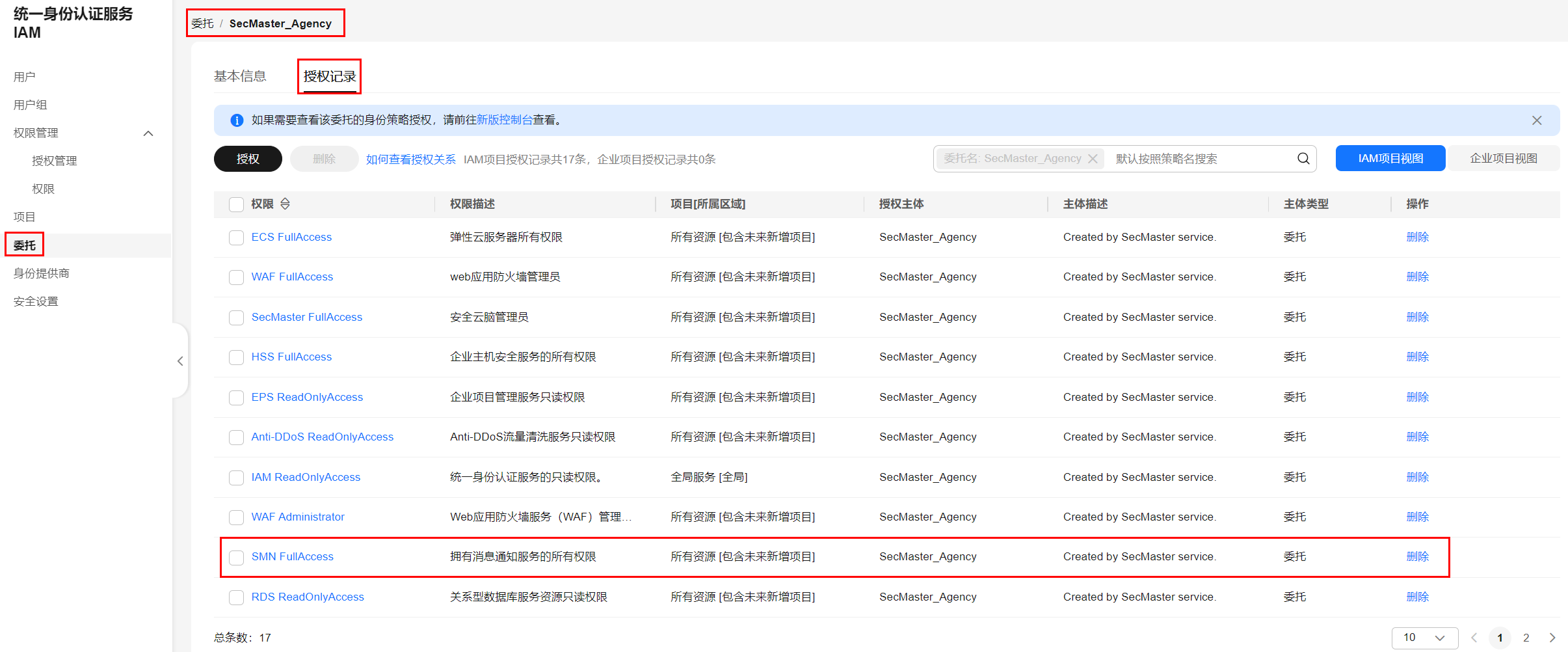 - 在左侧导航栏选择“委托”,在委托界面,单击委托名称“SecMaster_Agency”,然后选择“授权记录”页面,可查看所有授权主体为SecMaster_Agency的授权记录。