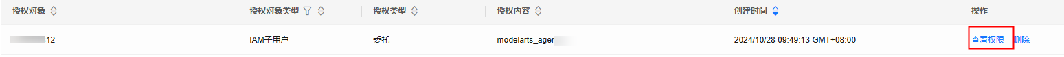- 登录ModelArts管理控制台,在左侧导航栏中选择“权限管理”,检查是否配置了访问授权。如果未配置,请先配置访问授权。参考使用委托授权完成操作。
