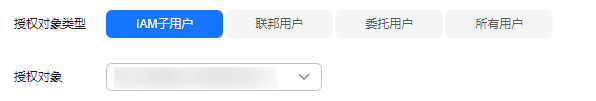 - IAM子用户:选择指定的IAM子用户,给指定的IAM子用户配置委托授权。