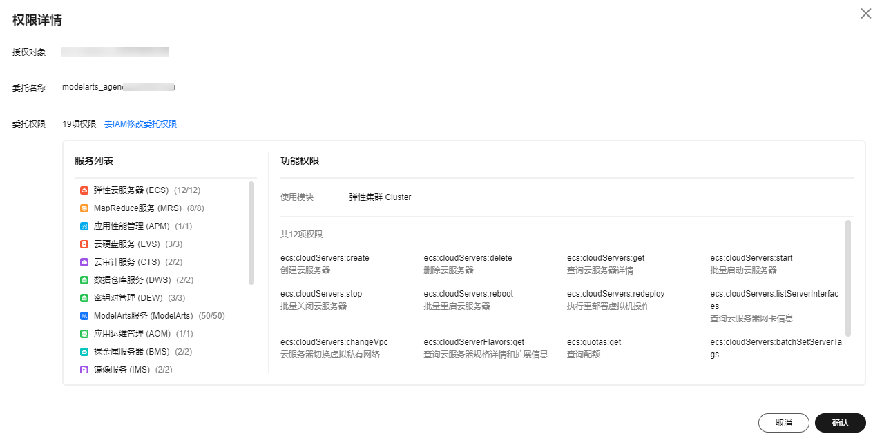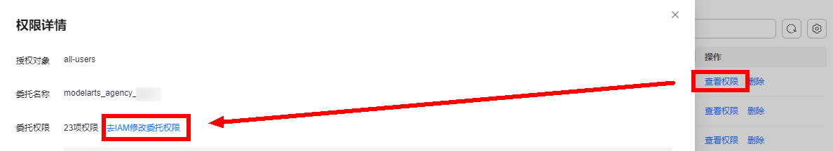 - 在查看授权详情时,如果想要修改授权范围,可以在权限详情页单击“去IAM修改委托权限”。