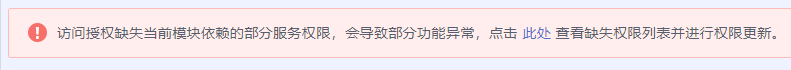 可能原因是用户委托权限配置不足或模块能力升级,需要更新授权信息。根据界面操作提示追加授权即可。