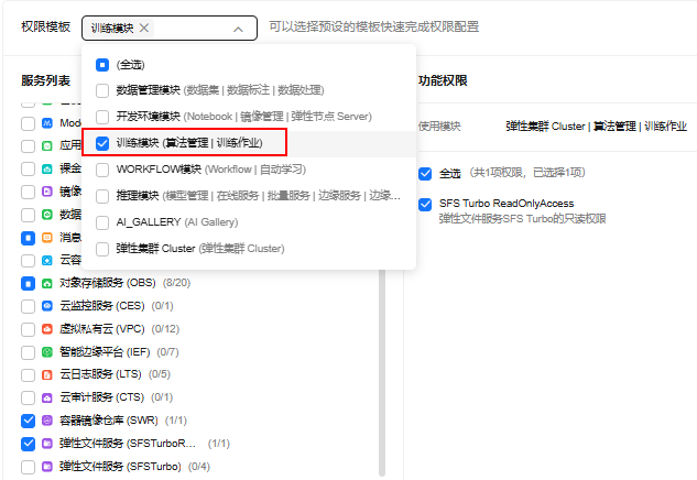 普通模式下提供了预设的权限模板,可以通过权限模板快速配置权限。如下图所示,选择“训练模块”的权限模板,系统会自动勾选训练模块所需的所有服务和对应的功能权限。