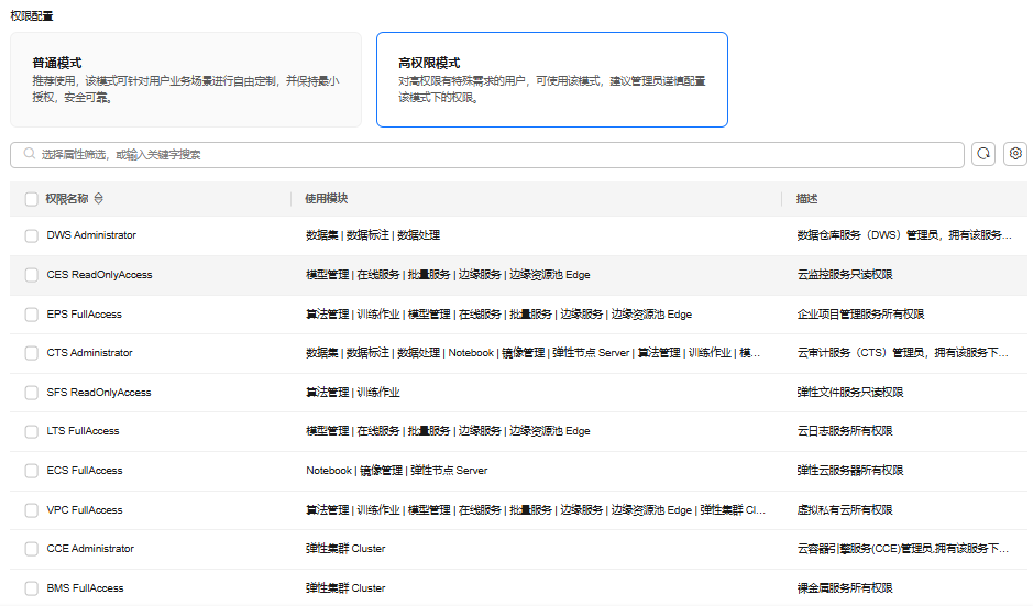 ModelArts Standard的权限配置支持普通模式和高权限模式两种方式。