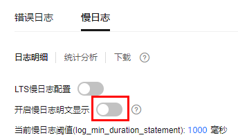 - 在左侧导航栏单击,在“慢日志”页签下选择“日志明细”页签,在“日志明细”页签下,单击“开启慢日志明文显示”右侧开关