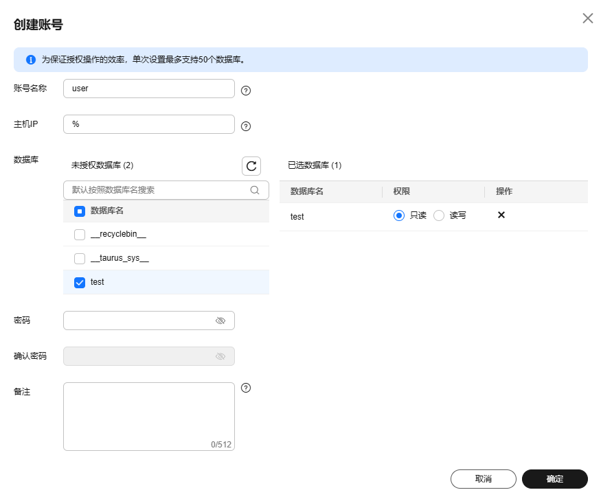 在未授权数据库侧勾选一个或多个未授权数据库,授予账号对选定数据库的权限。如果没有未授权数据库,您可以参考创建数据库进行创建,后期您也可以参考修改数据库账号权限对权限进行修改。