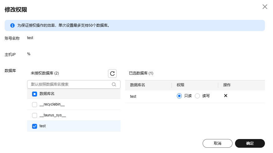 您可将自己创建的数据库账号,授权给指定的数据库,对于已授权的数据库,您也可取消授权。