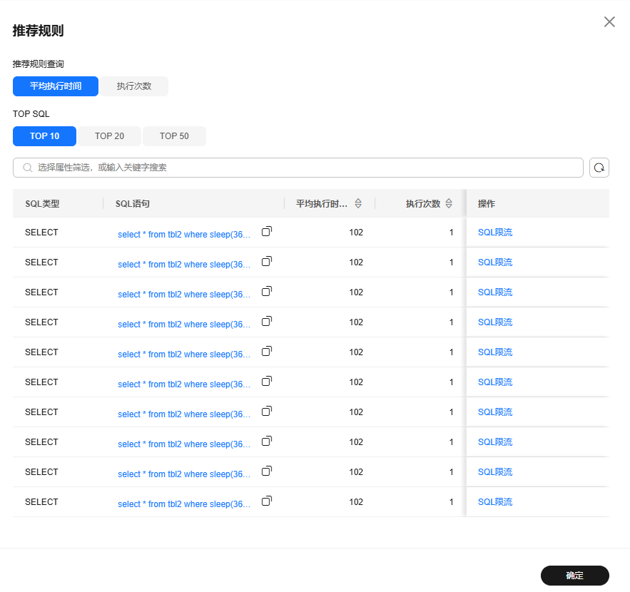 您也可以基于SQL的执行时间或执行次数,识别出性能消耗最高的SQL语句,并为这些高负载SQL创建相应的限流规则。