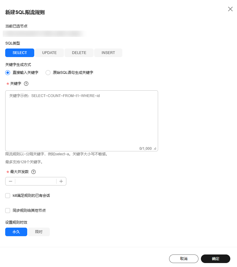- 单击“新建SQL限流规则”,选择需要限流的SQL类型、关键字以及最大并发数。