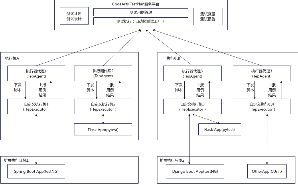 - 执行器代理(TepAgent):用户和服务平台交互,主动轮询获取执行测试任务,并将测试任务下发到执行器进行任务执行,将执行器上报的测试结果上报到服务平台。
