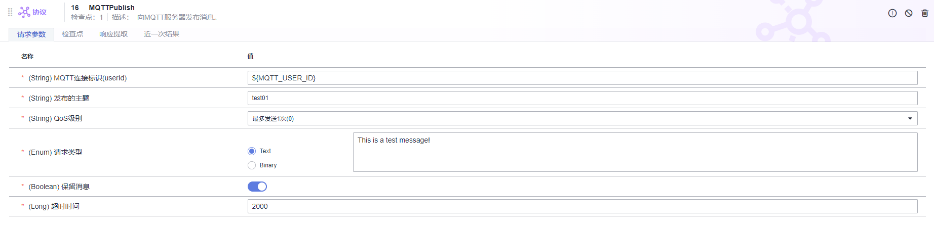 请求类型:枚举值(Text和Binary)。支持文本(Text)或二进制(Binary),当选择Binary时,用户输入的是十六进制字符串。 |