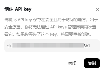 - 在“创建API key”弹窗页面,单击“复制”,复制API Key。